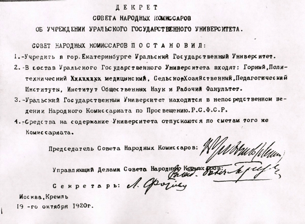 Декрет СНК РСФСР об учреждении Уральского государственного университета. 1920 г. Музейно-выставочный комплекс УрФУ.
