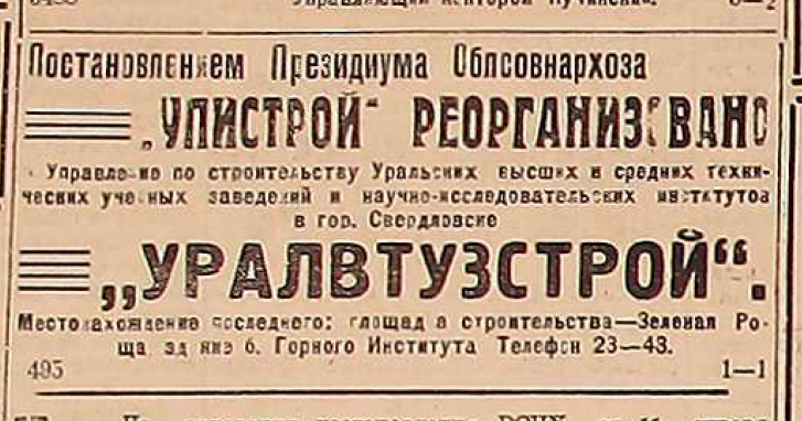 В Свердловске организован Уральский филиал союзной Академии наук (УФАН СССР). Начато проведение конкурса на проектирование комплекса зданий УФАН, не принесшего, однако, реальных результатов.